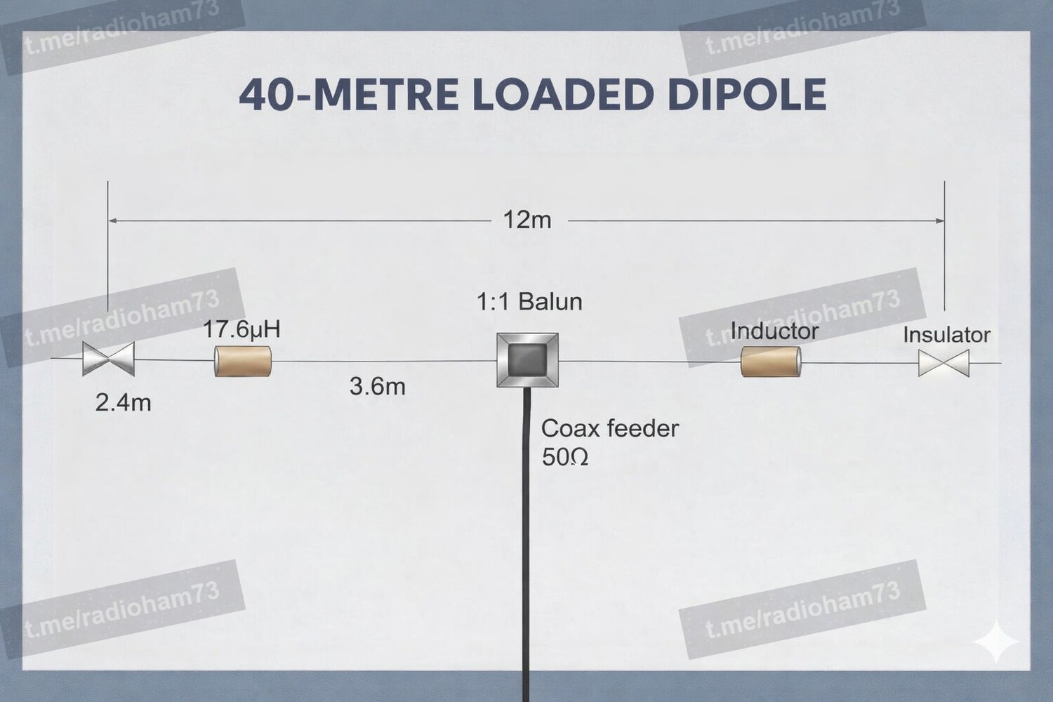 Центральная частота: ~7,1 МГц (диапазон 40 метров) Общая длина антенны: ~12 м (укороченная по сравнению с полноразмерным диполем ~20 м) Длина каждой ветви (до нагрузки): Внутренняя секция провода: ~3,6 м Внешняя секция провода: ~2,4 м Индуктивность нагрузочной катушки (на ветвь): ~17,6 мкГн Диаметр каркаса катушки: ~50 мм, пластиковая трубка Провод для катушки: ~2 мм, изолированная медная проволока Количество витков на катушке: ~22 витка Точка питания: центральное питание коаксиальным кабелем (рекомендуется дроссель/балун) Сопротивление питания: ~50–70 Ом в резонансе. Метод настройки: подгонка длины провода + регулировка витков катушки. Ожидаемая полоса пропускания на 40 м: сужена по сравнению с полноразмерным диполем.